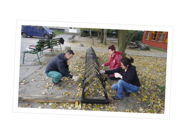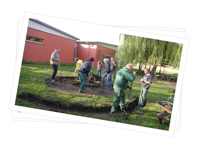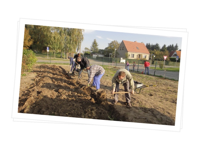 Bei schönem Herbstwetter fanden sich zu unserem ersten Arbeitseinsatz in diesem Schuljahr zahlreiche Eltern und sogar Kinder ein, um unseren Schulhof zu verschönern. Da wurden die Fahrradständer gemalert, neue Sitzgelegenheiten geschaffen, der Weidentunnel geflochten, im Schulgarten Mist untergegraben, Sträucher gepflanzt und die Arbeiten für eine Freilichtbühne begonnen. Selbst die Kinder waren mit Eifer dabei. Am Ende konnten alle Beteiligten nach drei Stunden fleißiger Arbeit feststellen, dass wir wieder ein Stückchen weitergekommen sind, um einen Schulhof zu schaffen, auf dem sich die Kinder gern aufhalten und in den Pausen gut erholen können. Unser Dank gilt allen beteiligten Eltern, Frau Dietrich, die den Stalldung organisierte, und der Landschaftsgestalterin Frau Tischer, die die Errichtung der Freilichtbühne nach unseren Wünschen plant, leitet und durchführt.