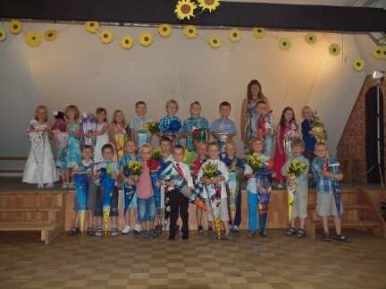 Als Frau Stuht die ersten Kinder auf die Bühne bittet, gibt es kein Halten mehr. Die aufgeregten ABC-Schützen erhalten von ihren nicht minder aufgeregten Eltern die lang ersehnten Schultüten. Gratulationen und ein Blumensträußchen gibt es auch vom Schulleiter Herrn Leu und dem Schulförderverein. Viele Fotos werden gemacht und nach einem großen Gemeinschaftsbild geht es mit Frau Stuht in die Grundschule. Dort warten einige Überraschungen auf die Schüler der 1. Klasse.