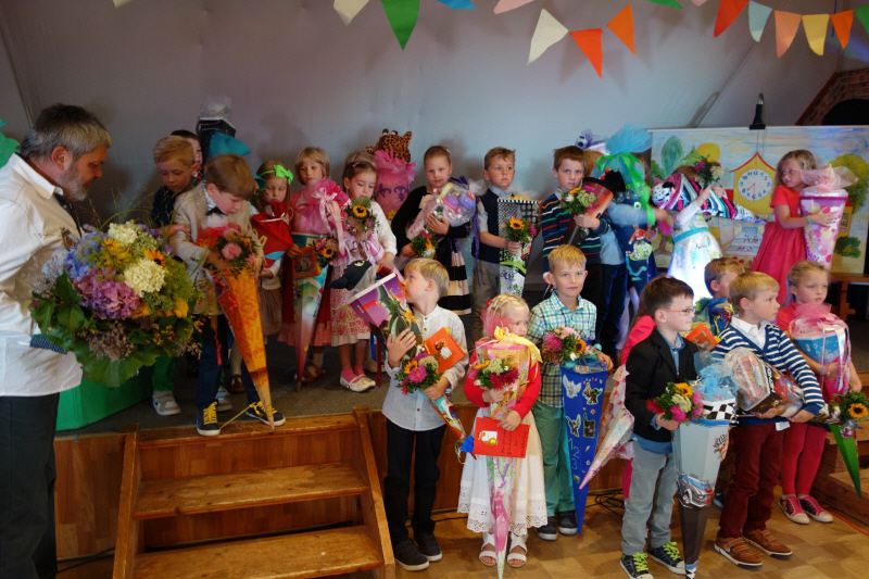 Mit großer Vorfreude und kaum auszuhaltender Spannung fieberten unsere Erstklässler ihrer Einschulung entgegen. Diese wurde traditionell im Feuerwehrgebäude der Gemeinde Neuenkirchen in einer Feierstunde mit einem Willkommensprogramm der Zweitklässler begangen. Dieses Jahr wurde ein Theaterstück präsentiert, bei dem die Schulanfänger Häschen und Zwergen dabei halfen, Ziffern und Buchstaben zu lernen. Nach einer Begrüßungsrede des Schulleiters Herrn Leu erhielten die aufgeregten Kinder endlich die Schultüten von ihren Eltern und Verwandten sowie je einen Begrüßungsstrauß vom Förderverein der Schule am Bodden. Der Bürgermeister der Gemeinde Neuenkirchen, Herr Weichbrodt, wünschte den Klassenlehrern der beiden ersten Klassen viel Erfolg bei ihrer Arbeit und überreichte Frau Grätsch (Kl. 1a) und Herrn Katannek (Kl. 1 b) einen Blumenstrauß. Natürlich durften alle Schulanfänger auch ihren Klassenraum besichtigen, dort ihren Platz einnehmen und ihre Bücher sowie Hefte in die Schultaschen packen.