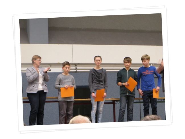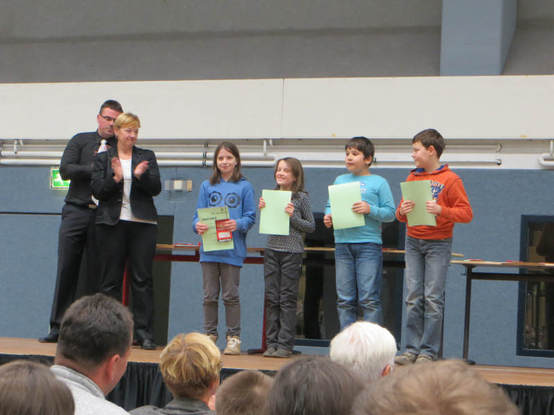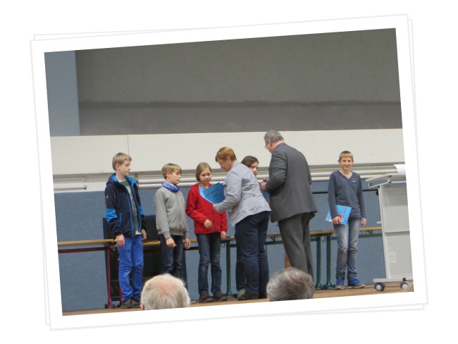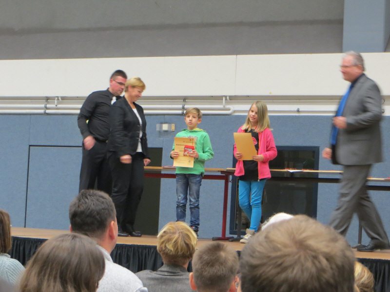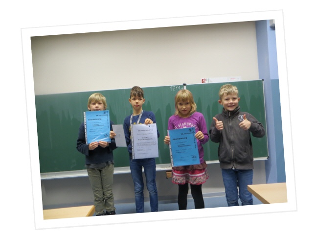Besonders stolz sind wir auf das Ergebnis von Ashley-Lynn Bartel aus der Klasse 5b. Mit 335 von 350 möglichen Punkten wurde sie Siegerin aller in Deutschland angetretenen Fünftklässer. Glücklich und aufgeregt konnte sie ihren Pokal bei der Siegerehrung entgegen nehmen.